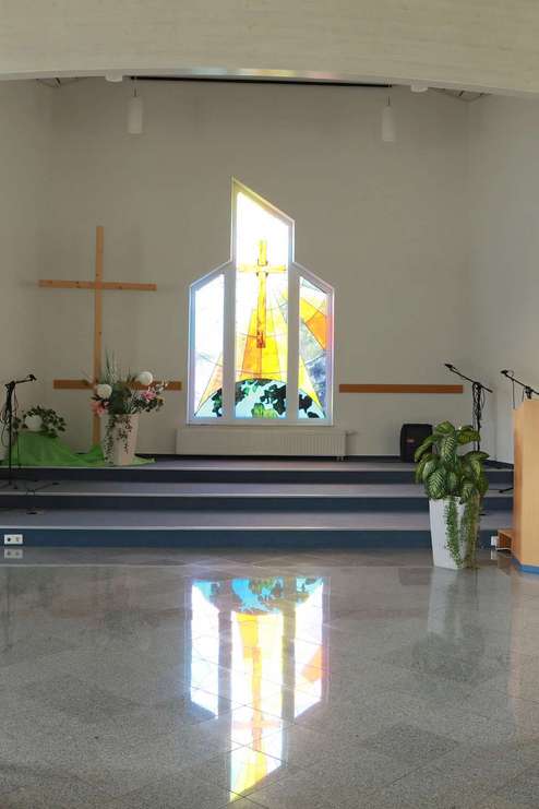 Neben dem großen Gottesdienstsaal gibt es verschiedene Gruppenräume mit guter technischen Ausstattung und eine große Küche.